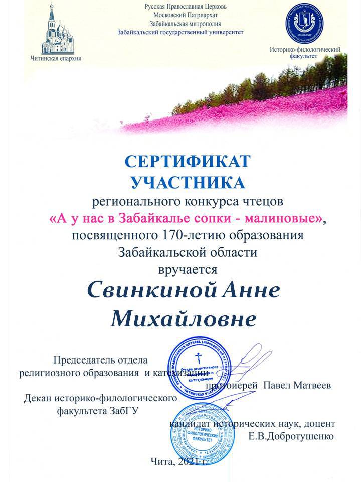 3. Сертификаты за активное участие в региональном конкурсе чтецов «А у нас в Забайкалье сопки – малиновые», посвящённого 170-летию образования Забайкальской области, получили учащиеся: